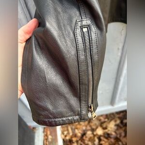 Gorgeous soft Sheepskin Leather Moto style jacket. 4 zippered pockets. Zipped sleeve details. Mandarin collar. Side ring detailing.