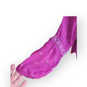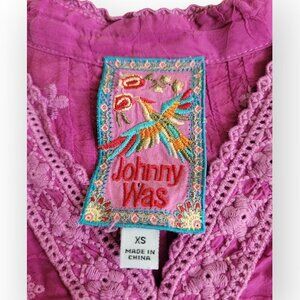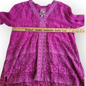 A refined, artisan-crafted blouse from Johnny Was, designed in a saturated magenta that reads polished rather than loud. The eyelet embroidery adds texture and delicacy, creating a piece that feels effortless, elevated, and quietly expressive.