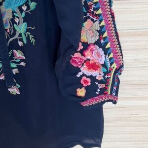 Johnny Was floral rayon embroidered tunic top sz XS blue multicolor buttons tie