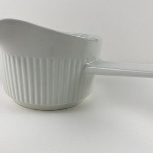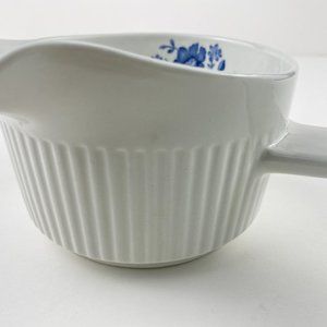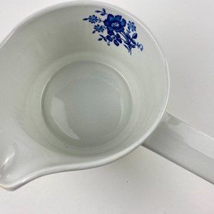 This interesting vintage ironstone gravy or sauce boat is in Scandia Blue. This discontinued Johnson Brothers pattern was made between 1965-1970, and has a more MCM esthetic than most blue and white transferware. Bright white with a small blue floral spray motif on the inside of the jug. There is no underplate included.