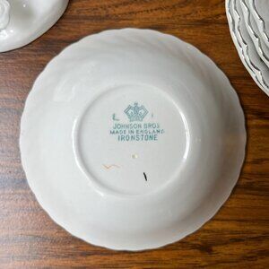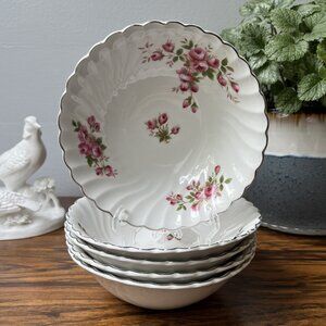 Description 🌺 5 vintage ironstone cereal bowls by Johnson Brothers, England. Regency shape, pink roses and platinum rim.