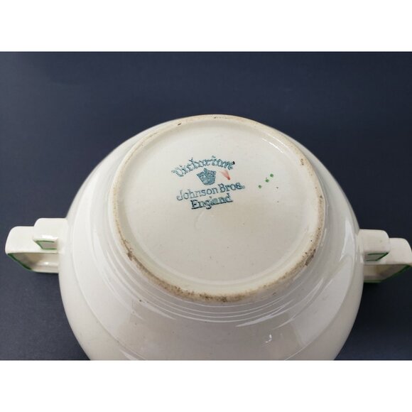 Good vintage condition Johnson Brothers sugar bowl with lid, featuring a cream base and Victorian floral cross-stitch pattern. Some crazing present, but no chips or cracks. Unique square-shaped handles with green painted lines around the handles, top edge, and lid rim. Measures approx. 2.25" tall, 3.25" diameter, and 5.25" wide including handles. Made in England.