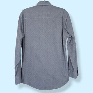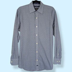 This shirt by Johnston & Murphy is made of a cotton/polyester blend (60/40) and features a blue and white small check pattern that has a secondary check pattern using the first check and a small houndstooth pattern. Zoom in to picture 3 to see what I mean, it's hard to explain. The shirt has long sleeves, button cuffs, a collar, button front, and rounded bottom. It is marked as a "tailored fit". There is normal wear, but no issues affecting wearability.