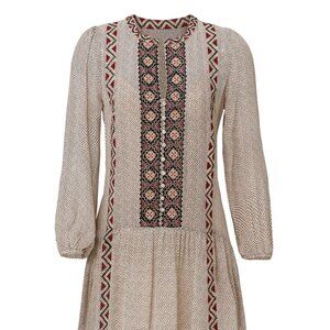 This Joie embroidered mini dress blends bohemian flair with effortless elegance. Crafted in a lightweight beige fabric with geometric embroidery in black and red, it features a split neckline, long sleeves with elastic cuffs, and a relaxed, flowy silhouette. Perfect for festivals, brunch, vacations, or casual summer days, this dress is as versatile as it is stylish.