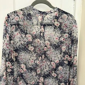Excellent preowned condition. Semi- sheer silk blouse. Black with blue pink green floral. Pleating on back. Band collar, V-neck, button up. Long sleeves with button closure.Joie size chart in photos