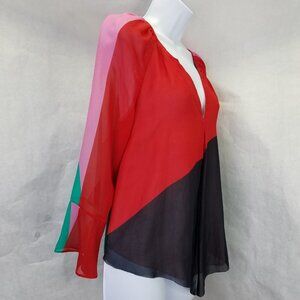 Joie Blouse Women's S Silk Top Bell Sleeve Sheer Chiffon Color Block Print Red