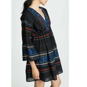 Joie Boho Embroidered Cotton Mini Dress Small Black VNeck Blue Shada Bell Sleeve
