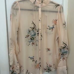 Romantic floral blouse with pleated colour and puffy sleeves constructed of sheer silk. High neck, long ruched sleeves, button front, shirttail him. 100% silk. Size medium. Fits true to size.
