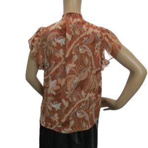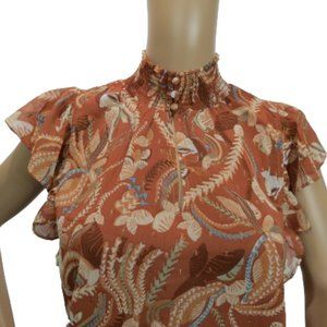 Introducing our Joie floral print blouse. Crafted with meticulous attention to detail, this blouse features a ruffle-style neck with button detailing, flutter sleeves, and a subtle keyhole front. The flutter sleeves gracefully cascade down the arms, creating a sense of movement and whimsy with every step. This lends an air of effortless grace to any ensemble, perfect for both casual outings and special occasions alike. Embrace timeless elegance with this versatile wardrobe staple. Blouse is new with tags attached.