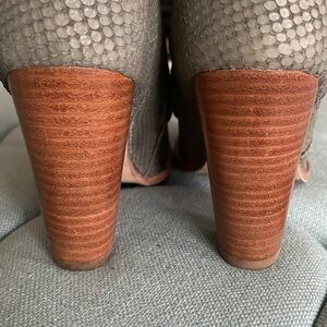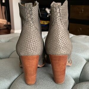 Joie grey leather heeled ankle boot with snakeskin pattern and stacked heel. Zipper closure on the inside of the boot. Size 36. Very good used condition. The colour is grey but seems like it has a slight green to it. Some light scratches on the trim of the foot and some very minor marks on the leather. One shown on the top of the foot on the left boot (shown in photo). And one small one on the back of the right boot above the heel. There is also two watermarks on the inside of the shoe (photos). These boots are still on amazing shape with signs of light wear. Please see photos measurements included in photos.