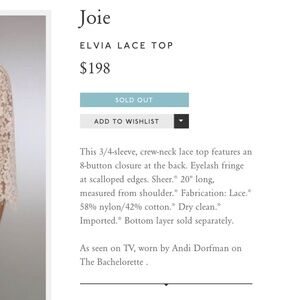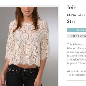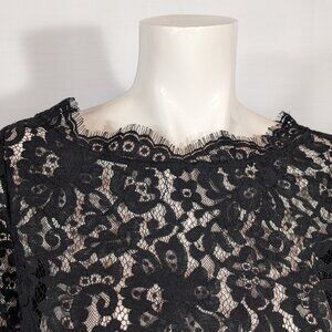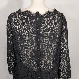 Black lace blouse has lace edge boat neck, button back, scalloped hem. 3/4 length sleeves. As seen on 'The Bachelorette’. Like new condition. Originally $198 USD.