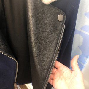 Navy wool, black leather, faux shearling. In excellent condition, worn only a couple times. Size XS.