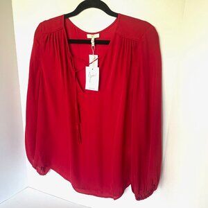 Joie Odelette Silk Top Womens Medium Red V Neck Tassel Ties Long Sleeve Blouse