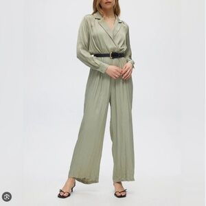 Silky and soft, this sage green pantsuit by Joie is made of a really nice weight satin! Style this with a blazer and belt for work or dress it up with jewelry and heels, either way you will feel like you are in your PJ's! Has belt loops but no belt attached. Re-poshing from @svstylegems, I love this piece but I am just too short for it (5'-2") Colour is light sage green. Last photo is stock image and shows the colour best. 100% polyester, PTP 20", waist 15- 18.5"+ Inseam 29"