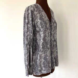 Black and white animal print silk blouse has button front closure, V-neck, back yoke with centre pleating and button cuff.