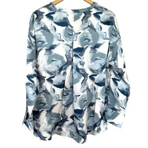 Chic abstract print with a v-neck. Long sleeves and relaxed fit. Ideal for versatile styling. The silk is impossibly soft to the touch and feels wonderful on.