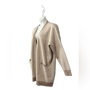 Add a touch of effortless style to your wardrobe with this beautiful plus size Joie open cardigan. Made from a soft blend of rayon, polyester, and nylon, it offers optimal comfort and a flattering fit. The beige and white chevron pattern provides a distinctive look, while the two practical pockets add functionality. Perfect for layering over your favorite outfits, whether for a day at the office or a casual outing. Like new 👌 / 🚭