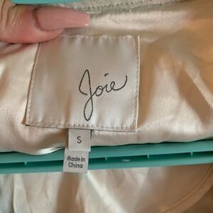 This Joie cream blazer features a sophisticated tweed texture and an asymmetrical front zipper, offering a modern twist on a classic design. Its cropped length and collarless neckline with slight lapel detail make it a versatile addition to any wardrobe, perfect for both professional and casual settings.