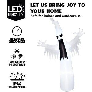 EXCELLENT DESIGN. This 12 ft tall Halloween Inflatable towering spooky ghost is the perfect addition to your Halloween Eerie Night. It brings a different kind of fun to your Halloween holiday. This inflatable comes with an extended cord, ground stakes, fastened ropes, built-in sandbags, and a plug with UL certification. These features help secure the ghost in place, preventing it from being blown away by wind outdoors.