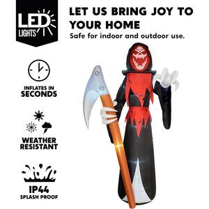 Great Functions. Equipped with built-in LED lights, this blow up grim reaper illuminates your Halloween display with a bright and eerie glow. The addition of an inflatable sickle accessory enhances the overall effect, adding an extra touch of authenticity to the grim reaper's appearance. The face of the grim reaper glows red, intensifying the spooky ambiance.