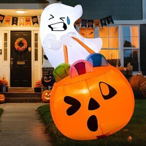 Excellent Design. This 5 ft tall Halloween Ghost Lift Pumpkin Candy Bag inflatable is the perfect addition to your Halloween night. It is an amazing Halloween decoration, you can place it in the yard, garden and lawn. It brings a lot of fun to your Halloween holiday. This inflatable comes with an extended cord, ground stakes, fastened ropes, built-in sandbags, and a plug with UL certification. These features help secure the ghost in place, preventing it from being blown away by wind outdoors.