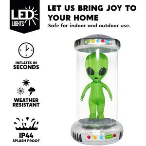 Stunning Design. This 7ft tall Halloween inflatable Test Tube with Alien is a sight to behold. Its unique design features an alien creature encased within a towering test tube, capturing the attention of people who see it. The attention to detail is impeccable, from the alien's intricate features to the vibrant colors that bring it to life. Product size 4 x 4 x 7 feet. This inflatable comes with an extended cord, ground stakes, fastened ropes, built-in sandbags, and a plug with UL certification.