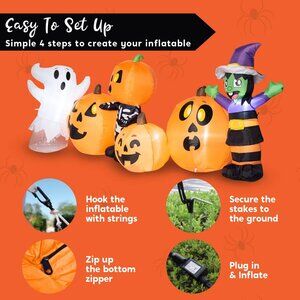 Excellent Design. This 8ft long Halloween Inflatable characters with pumpkin patch is the perfect decoration for your Halloween Eerie Night. It brings a different kind of fun to your Halloween holiday. This inflatable comes with an extended cord, ground stakes, fastened ropes, built-in sandbags, and a plug with UL certification. These features help secure the pumpkin characters in place, preventing it from being blown away by wind outdoors.