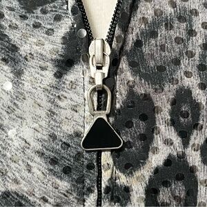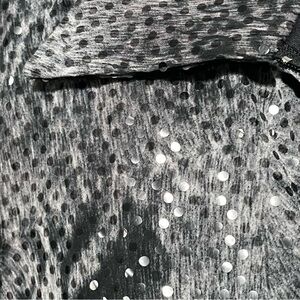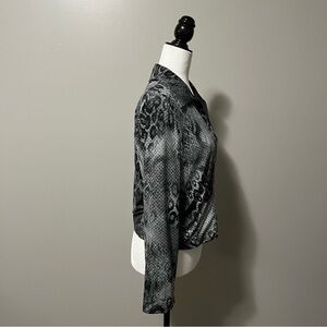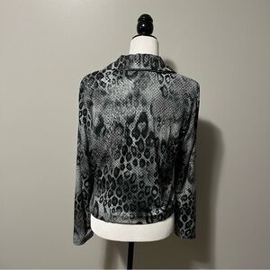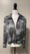 Excellent condition. Black and grey animal print pattern with clear sequins for a glittery effect. Fully lined. Fold down collar. Light shoulder pads. Full zip waist length.