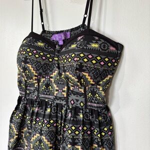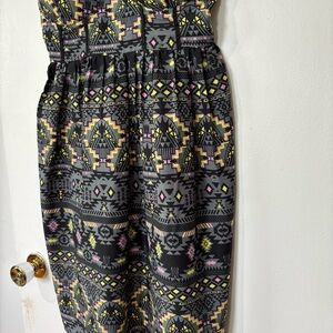 This Jolie strapless dress features a structured sweetheart bodice and colorful tribal/aztec-inspired print with hints of pink, yellow, and grey. Soft elastic band at top and a comfortable mid-thigh length. Perfect for summer outings, festivals or beach days. Measurements: PTP 17" | Length: 30". Condition: 9/10.