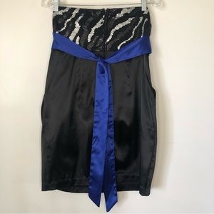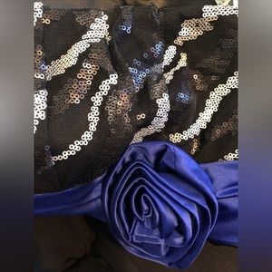 Satiny bottom with fitted bodice covered in waves of silver and black sequins. Royal blue satin belt and 3D rosette.
