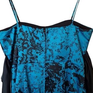 Beautiful blue and black Jolie semi-formal prom grad wedding party dress. Black silky ribbon in the front ties in the back with white clear beaded flower. Slit on the side. Zippers down half way in the back. Thin strap. Padded top. Size 12P