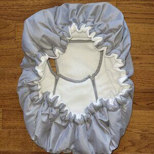 Snuggly cover for an infant carrier. Has peak window, zipper for more access and elastic for easy on/off and good fit.