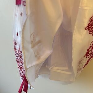 Elegant burgundy top with a bow. White skirt with intricate burgundy embroidery. Perfect for special occasions.