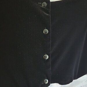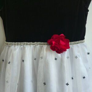 This beautiful Jona Michelle dress is perfect for any special occasion, from a formal event to a holiday party. The dress features a classic black stretch velvet sleeveless bodice with a lovely red flower and pearl waist detail. The highlight is the full, layered skirt with black flocking and glitter pattern on white tulle, creating a sparkly and whimsical effect. The dress has a button up back.
