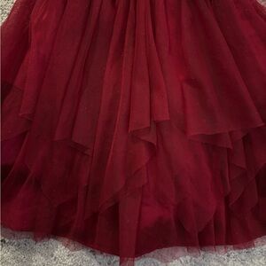 Luxurious red velvet dress with bow at waist by Jona Michelle. Tie bow waist. Sparkle tulle skirt with pixie cut points. Like new condition. Size 3. Smoke and pet free home.