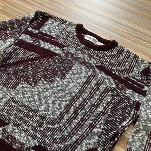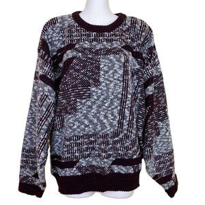 Vintage Jonathan Bryan: Exclusively at Jack Fraser knit pullover sweater has abstract design in a red/grey colorway. 100% acrylic for easy wash/wear (machine washable). Tag size "Large", relaxed fit, - see below for garment measurements. Pre-owned condition, knit fabric has some pilling as is typical in a knit garment.