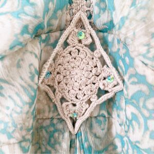 Dress has flowy crepe feeling material with a robin egg blue and oatmeal beige floral pattern. Empire waist has an oatmeal beige embroidered diamond detail that goes up and around the Vneckline.