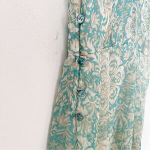 Dress has flowy crepe feeling material with a robin egg blue and oatmeal beige floral pattern. Empire waist has an oatmeal beige embroidered diamond detail that goes up and around the Vneckline.