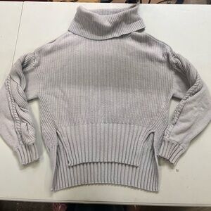 The Chloe Sweater by SIMKHAI features a modern cold-shoulder design with a folded turtleneck and twisted cable-knit sleeves for elevated texture. The relaxed fit & dropped shoulders create a laid-back yet polished silhouette. Measures approx 20” shoulder to hem