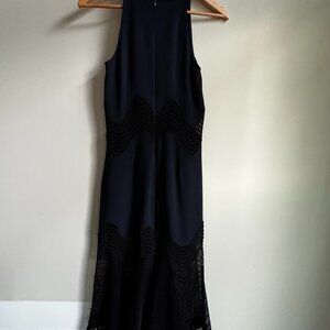 Navy knit dress by Jonathan Simkhai, with mock turtleneck, neckline with mesh detailing as well.