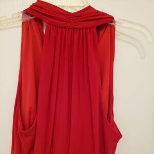 This beautiful red halter dress will certainly have someone singing "The Lady In Red" when you wear it. This sexy little number shows off your shoulders, some cleavage and yet isn't too daring. The skirt is flared but not overly. Just enough to move when you do. Very comfortable fitting dress. Simply machine wash and dry on gentle cool settings it will be ready for your next outing. The size is a 10 With Bust: 36"; Waist 30"; Hips 36"; Length 45" All my clothes are in closet away far from any cooking and with cedar bars, humidity controlled in home with non smokers hair dogs.