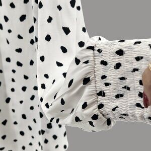 The long-sleeve silhouette is enhanced by stylish details like gathered cuffs and a chic tie neckline, elevating its feminine charm. Crafted from lightweight fabric, it's comfortable for all-day wear and perfect for transitioning from the office to a night out.