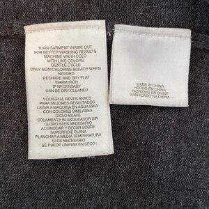 Jones New York Turtleneck Sweater. JNY Signature label. 100% merino wool. Soft, lightweight, thin knit with subtle ribbing around bottom hem, turtleneck and cuffs. Dark speckled charcoal grey. Fold-over turtleneck style. Fitted shape. Fabric has some stretch.