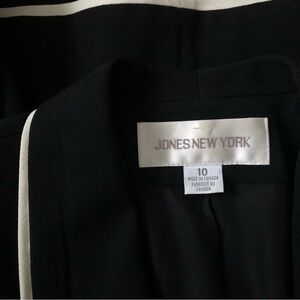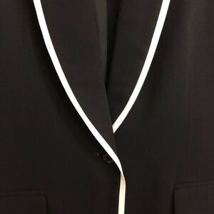 Sophisticated classic black blazer with stylish white trim. Perfect for professional and evening settings. One button front closure, two flap pockets.