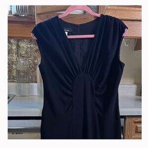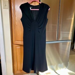 Soft V-neckline gathers at front; smooth inset flows down to a slight flared hemline.