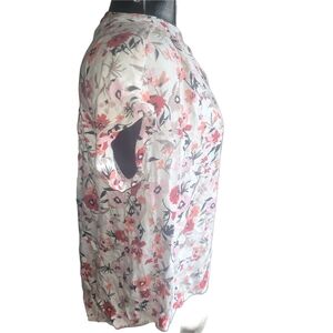 Elevate your style with this chic floral print top. Featuring a blend of pink and red hues, this top is perfect for any occasion. Has an open V-neck and rolled cuffs. 100% rayon