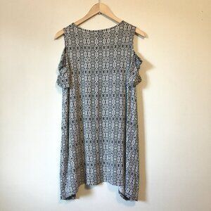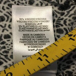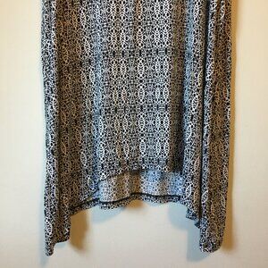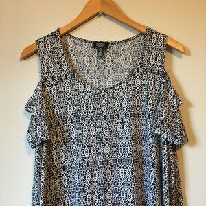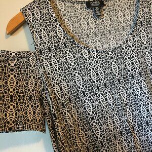 Very good preowned condition, cold shoulder/off shoulder, handkerchief hem, stretchy viscose shirt by Jones New York. Probably not quite long enough to be worn as a dress, but would still look very cute with opaque tights, a short black mini skirt and black booties or cowboy boots. Cute.