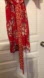 Elegant red kimono robe with floral pattern by Jones New York. Gold, blue, white, yellow, green on red background. Lightweight and comfortable. Perfect for lounging and some sexy time. Measures approximately 19 inches from pit to pit. In perfect condition, its belt is secured at the back and goes through the belt loops to tie at the front. Thanks for looking !