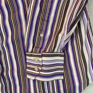 Jones New York Signature Shirt. Women's 2X. Purple, brown and white stripes. Metal backed buttons. 3-button cuff. Darts for shaping.