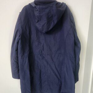 Navy ladies hooded short trench coat. Front zip closure, storm fly with snaps. Two front pockets. Outer fabric is 71% cotton; fully lined. Size XL, length 33 inches from back neck to hem. Machine wash, drip dry. Non-smoking home, no pets.